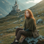Composition: diagonal lines of the hill naturally guide the viewer’s eye upward from the subject toward the mountains and castle, reinforcing scale and solitude. The color grading maintains a cinematic realism — muted earthy tones, balanced teal-orange hues, subtle film grain, and fine contrast.