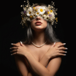 Using my face from uploaded photo, Create Ultra-high-resolution photo, realistic, close-up portrait of a user with slightly wavy hair. Props: An ornate blindfold or mask meticulously crafted from a mix of dried and fresh flowers (including white daisies, yellow flowers, dried grasses, and small purple and white florets) woven into a delicate white sheer fabric. A simple, single-strand pearl necklace. Attire: Bare shoulders, suggesting a strapless gown or minimal top. Pose: Head slightly tilted, looking forward or slightly upwards (eyes obscured by the mask). Arms are crossed in front of her bare chest, with hands gently resting on user shoulders or upper arms, showcasing long white manicured nails. Face Details: Natural-toned, slightly glossy, full lips; emphasis only on the lower half of the face. Lighting: Dramatic, warm, and highly concentrated spotlight (key light) from the front or slightly above, creating strong contrast between the well-lit subject and the deep shadows. Background: Solid, pitch-black background, ensuring the subject pops dramatically. Camera: Shot on a medium format camera (e.g., Fujifilm GFX 100S) with a 120mm macro lens, F/4.0 aperture, emphasizing extreme textural detail on the flowers and skin, deep blacks, high dynamic range, and a moody, editorial finish. Effect: Emphasize organic texture, dramatic lighting, and a fragile, ethereal beauty.