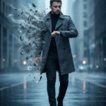 Edit this image to show a man walking forward on a rain-slicked urban street, positioned in the center-lower third of the frame, captured in a dramatic three-quarter view. He’s wearing a sophisticated charcoal gray trench coat over a black turtleneck and dark fitted trousers, with polished black leather boots. His hand is raised near his chest in a contemplative gesture, checking his watch. The left side of his body is dramatically disintegrating into an explosive dispersion effect-swirling smoke tendrils, ornate clockwork gears, shattered fragments, scattered papers, and metallic particles erupting outward in shades of silver, gray, and slate blue. The background features a misty urban canyon with towering buildings fading into a moody overcast sky. Cinematic depth of field with bokeh lights in the distance. Moody blue-gray color grading with high contrast. Photorealistic digital art style with surreal disintegration effects. 8K quality, dramatic lighting from above creating subtle highlights on the coat.