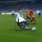 Realistic TV sports broadcast of a football match between Dynamo Kyiv and Shakhtar Donetsk — but all players are in wheelchairs. The game is intense, with realistic camera work — wide and medium shots from stadium stands and sidelines, smooth panning following the ball, close-ups on emotional reactions. Stadium lights on, full crowd cheering, chanting, clapping. Broadcast overlay with team logos and scoreline “Dynamo 1–1 Shakhtar.” Realistic movement of wheelchairs, bumping, fast passes, dramatic saves. Ukrainian commentators (energetic, humorous): «Ого! Який підкат на швидкості 10 кілометрів на годину — це ж справжній болід Формули-1!» «Шахтар відповідає — крутить як дрифт у Дніпрі!» «Гол! ГОЛ! А тепер — перевірка VAR на швидкість!»